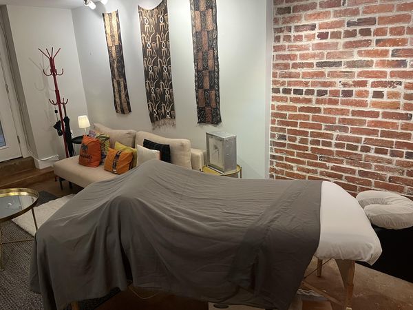 In-studio amenities: Drinking Water, Heated Massage Table, Hot Towels, Music, Shower
