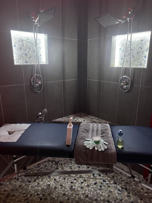 In-studio amenities: Aromatherapy Enhanced, Bottled Water, Candles, Free Parking, Hot Towels, Massage Table, Music, Private Restroom, Shower, Spa/Hot Tub