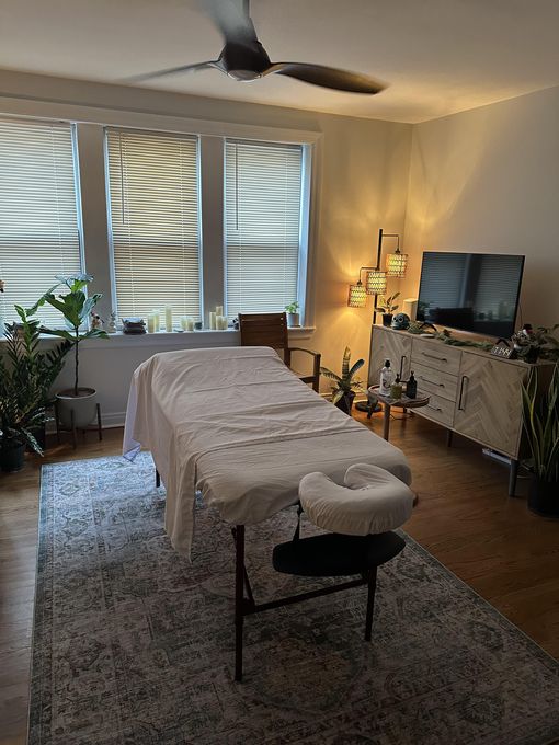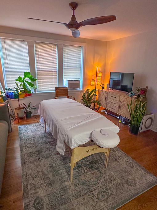 In-studio amenities: Drinking Water, Heated Massage Table, Massage Table, Music, Private Restroom, Secured Entrance/Doorman, Shower