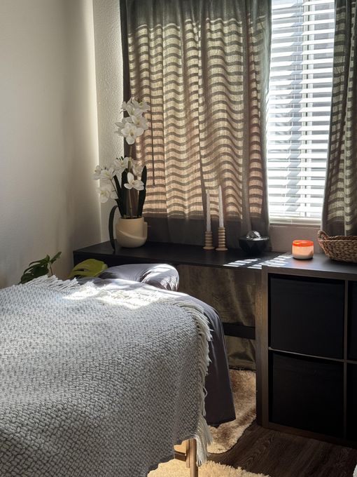 In-studio amenities: Bottled Water, Candles, Drinking Water, Free Parking, Hot Towels, Massage Table, Music, Private Parking, Private Restroom, Tea