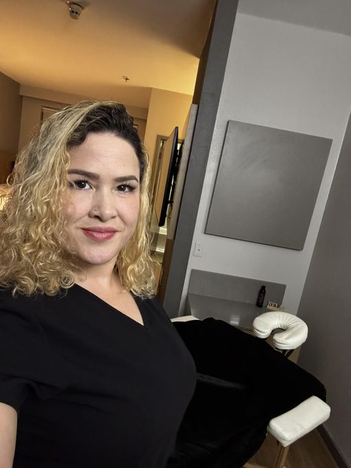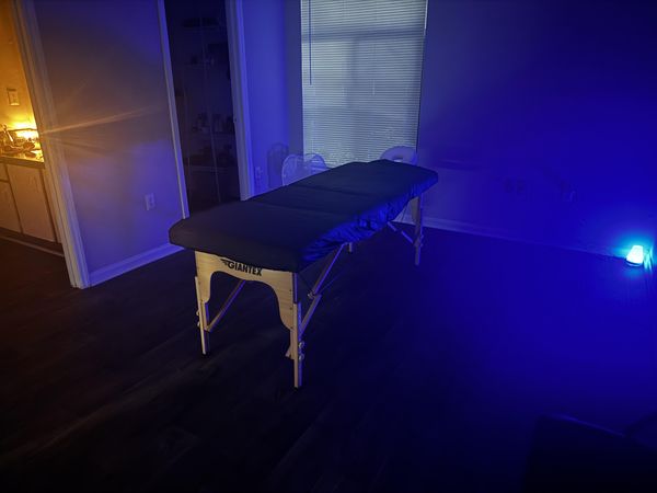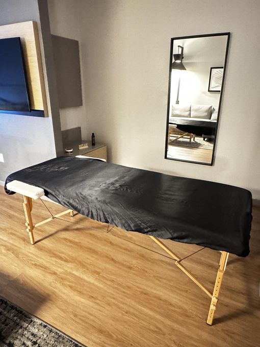 In-studio amenities: Bottled Water, Candles, Free Parking, Massage Table, Music, Private Restroom, Shower