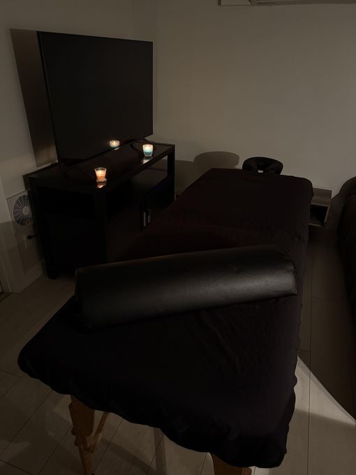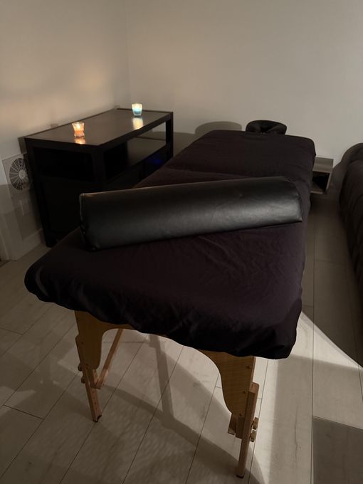 In-studio amenities: Aromatherapy Enhanced, Bottled Water, Candles, Free Parking, Massage Table, Music, Private Restroom, Shower, Tea
