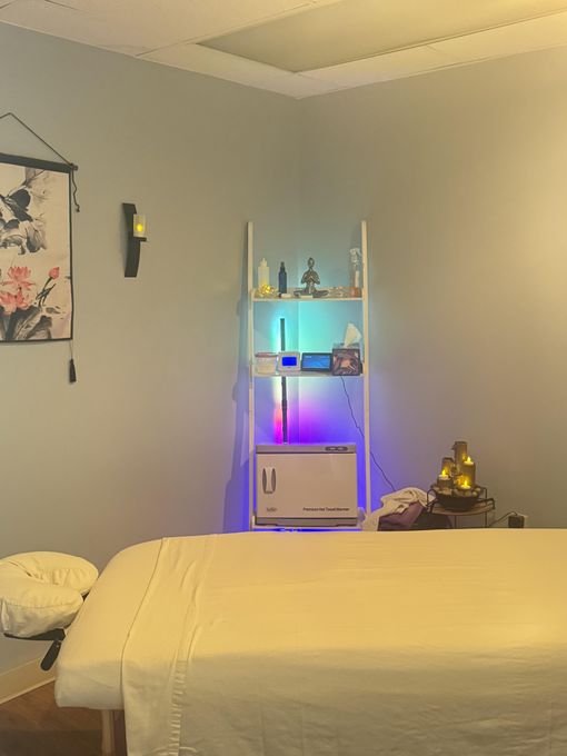 In-studio amenities: Bottled Water, Candles, Free Parking, Heated Massage Table, Hot Towels, Massage Table, Music