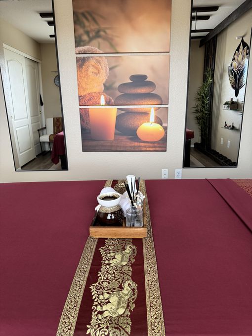 In-studio amenities: Bottled Water, Free Parking, Heated Massage Table, Hot Towels, Massage Table, Music, Tea